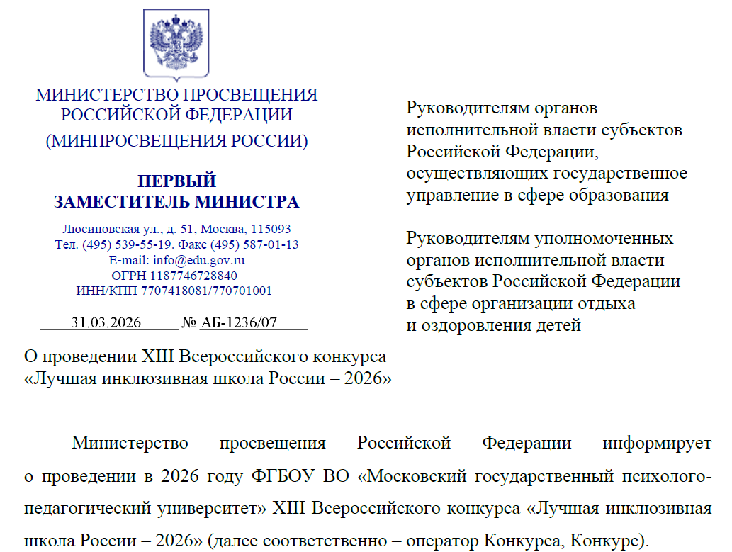 Стартовал XI Всероссийский конкурс «Лучшая инклюзивная школа России – 2024»